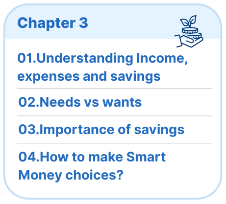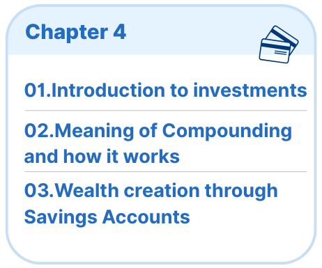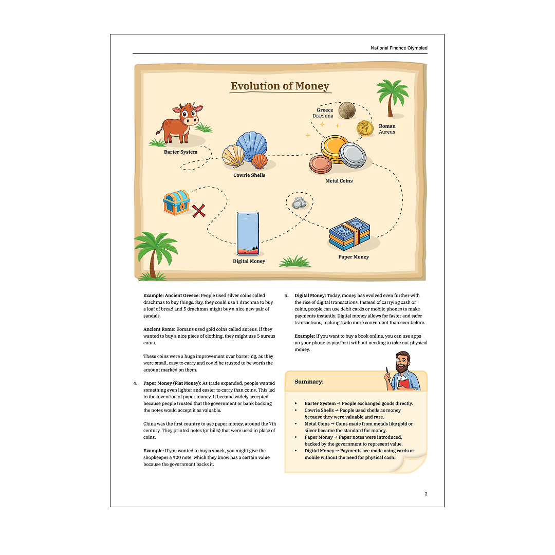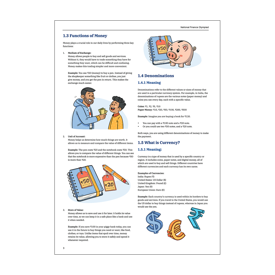 The handbook covers essential financial concepts including Money & Banking, Financial Planning, Investments, and Loans & Credits. Your child will learn about budgeting, digital payments, mutual funds, compound interest, insurance, and how to avoid debt—all explained with real-world examples and interactive tasks.