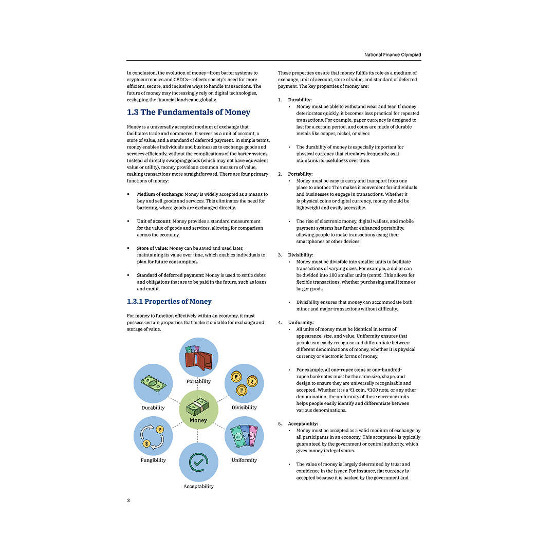 The handbook covers essential financial concepts including Money & Banking, Financial Planning, Investments, and Loans & Credits. Your child will learn about budgeting, digital payments, mutual funds, compound interest, insurance, and how to avoid debt—all explained with real-world examples and interactive tasks.
