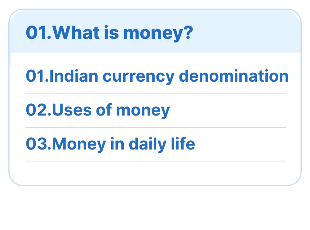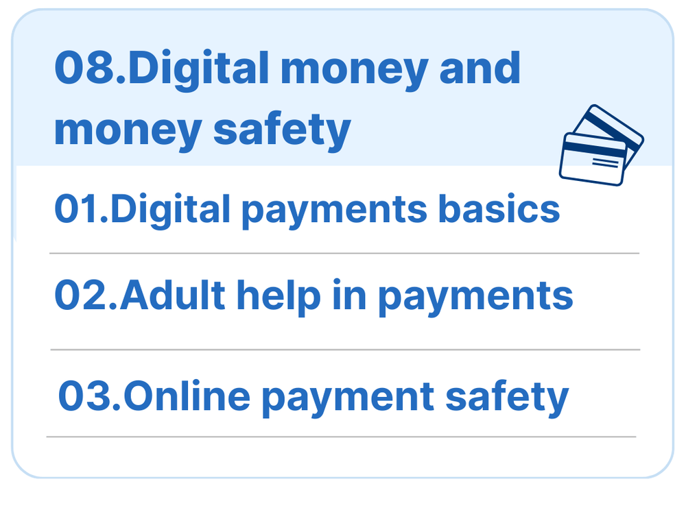 The handbook covers essential financial concepts including Money & Banking, Financial Planning, Investments, and Loans & Credits. Your child will learn about budgeting, digital payments, mutual funds, compound interest, insurance, and how to avoid debt—all explained with real-world examples and interactive tasks.