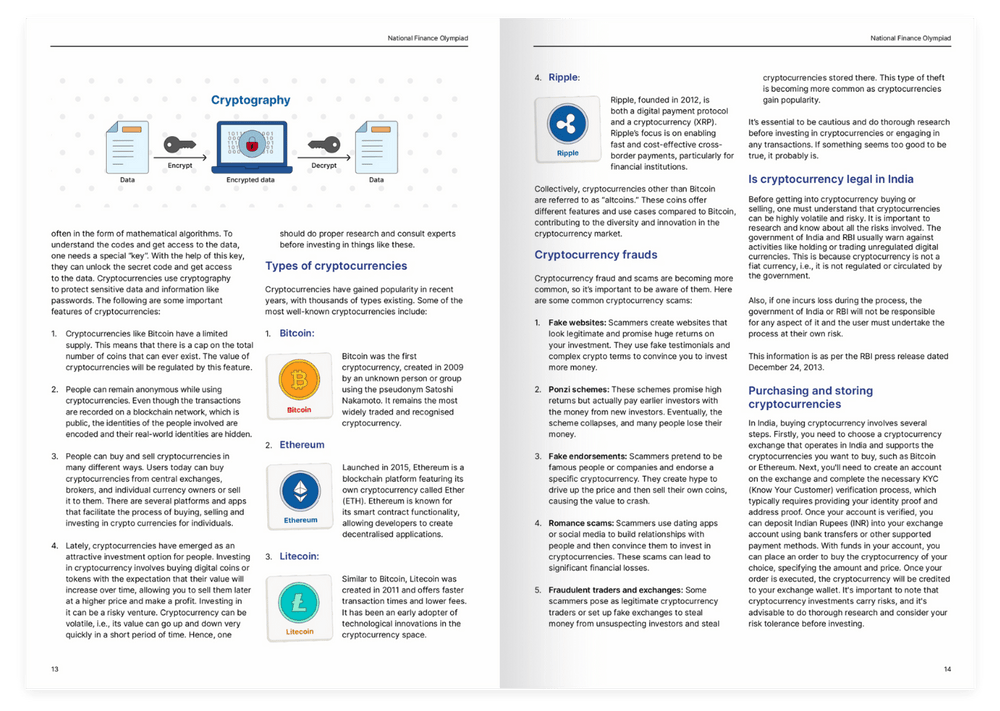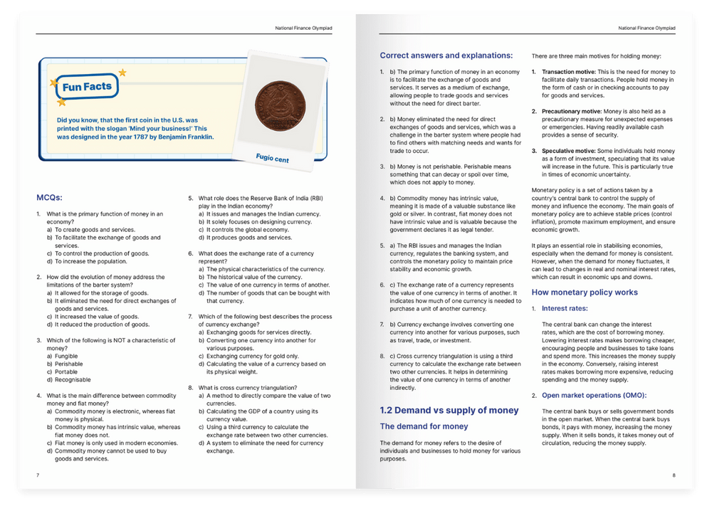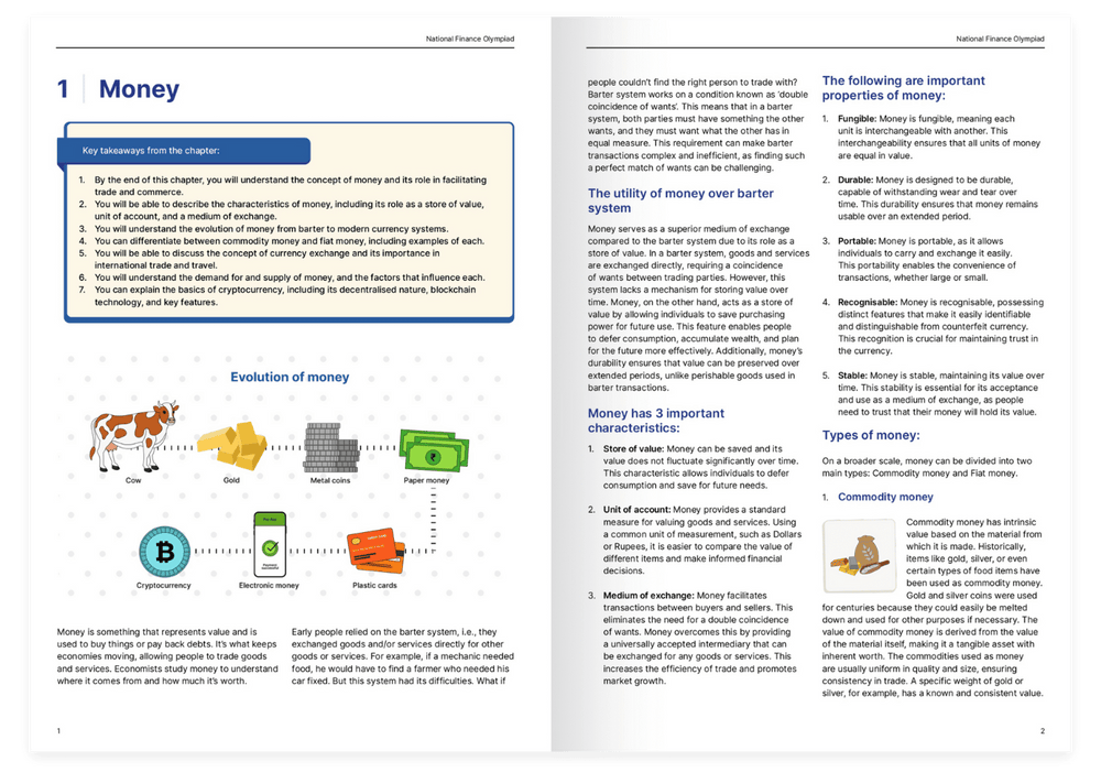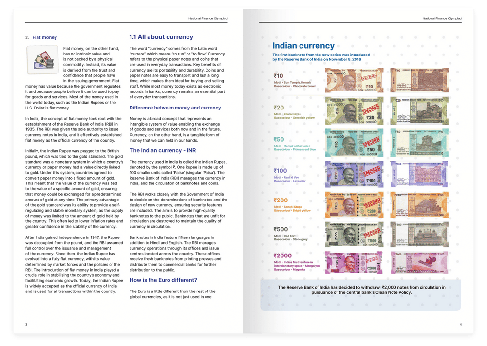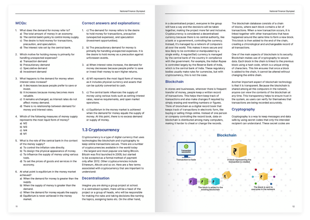 The handbook covers essential financial concepts including Money & Banking, Financial Planning, Investments, and Loans & Credits. Your child will learn about budgeting, digital payments, mutual funds, compound interest, insurance, and how to avoid debt—all explained with real-world examples and interactive tasks.