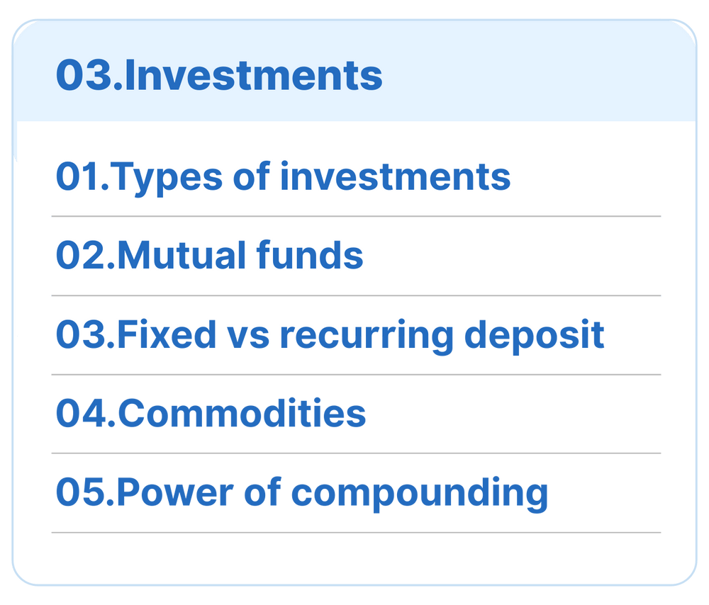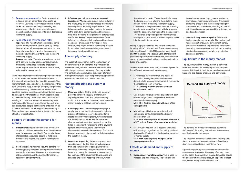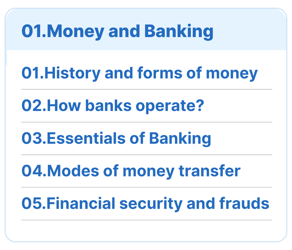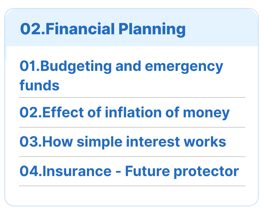 The handbook covers essential financial concepts including Money & Banking, Financial Planning, Investments, and Loans & Credits. Your child will learn about budgeting, digital payments, mutual funds, compound interest, insurance, and how to avoid debt—all explained with real-world examples and interactive tasks.